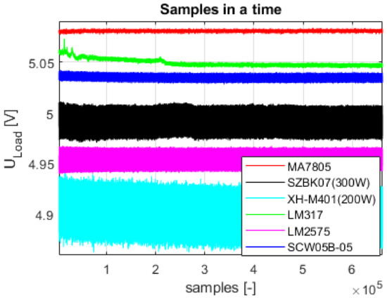 For the experiments, we chose two linear regulators MA7805, LM317 and four switching regulators SZBK07, LM2575, SCW05B-05, and XH-M401.