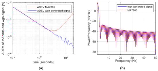 A comparison of MA7805 regulator measured values and wgn-generated values in MATLAB is shown in Figure 15a. Here, it can be seen that the white noise of a real MA7805 linear regulator and the generated wgn-values (based on coefficient) are similar in the first region of the ADEV curve. In the same way, of the linear regulator MA7805 and of the wgn-generated noise in Figure 15b are the same.