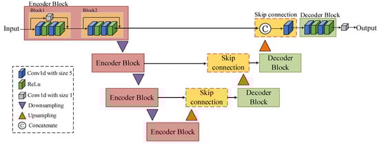 The primary network architecture we employ is the renowned U-Net. The specific network structure is depicted in Figure 5. Both the input and output of the entire network are one-dimensional tensors; therefore, prior to the commencement of training, unfolding processing is flattened for each sample tensor. The red rectangles represent the feature extraction module with residual connections, consisting of two blocks. Each block follows a “convolution (conv), rectified linear unit (ReLU), convolution (conv), rectified linear unit (ReLU)” structure, with residual connections added. The first block of each layer requires a convolution operator of size 1 at the connection point to unify the channel numbers, represented by gray cubes. The orange rectangles represent multi-scale skip connections, enabling the model to better utilize feature information from both high and low levels. The green rectangles represent the decoding module, which follows the same “convolution (conv), rectified linear unit (ReLU), convolution, rectified linear unit” connection method as the block modules above. Purple triangles indicate downsampling, implemented using 1D convolutions, while orange triangles represent upsampling operators, achieved using 1D deconvolutions. Finally, a convolution operator of size 1 (1D; thus, size = 1) is added as the output layer. The output layer inherits channel dimension information, yielding the reconstruction result.