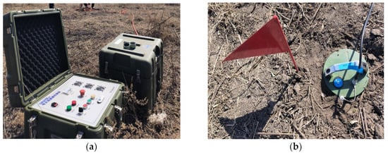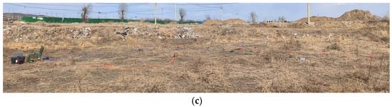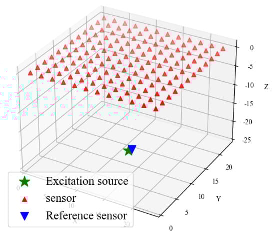 To verify the effectiveness of the proposed algorithm, real data are collected for calculation, and the following experiments are designed for validation. Take any point on the ground surface as the origin, and set the direction perpendicular to the ground as the z-axis direction. Use tools to measure a test area measuring 24 m long and 24 m wide. Then, deploy a seismic sensor array consisting of a square array formed by 144 sensors in total, as shown in Figure 6. Designate the coordinates of the seismic source at position (−0.87, 0.45, −24); additionally, deploy the position at (−0.51, −0.35, −24.31) for measuring vibration signals. Connect an electric spark seismic source device and initiate the explosion. After the explosion, observe the reception of signals to ensure normal signal reception by the sensors. The experimental layout is shown in Figure 6 and Figure 7.