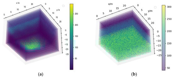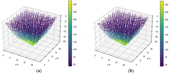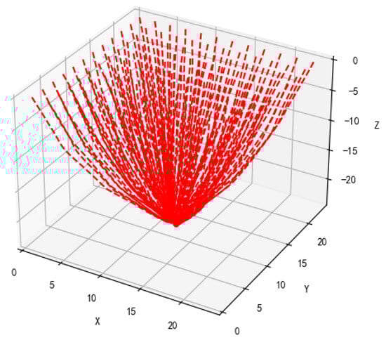 In the experiment, according to the requirements of the inversion reconstruction algorithm, the velocity model is determined by measuring the prior information of the shallow subsurface medium and the travel time information. The medium is divided into three layers at depths of 23.91 m, 15.93 m, and 8.10 m, respectively. Subsequently, the grid is discretized with a grid length of 0.8 m. The obtained complete data volume shape is . Using source location coordinates, sensor location coordinates, and velocity field model arrival time information, ray paths are searched based on Fermat’s principle, yielding coordinates of ray grid intersections and travel time information of seismic signals collected by each sensor as shown in Figure 10. The effectiveness rate of data in the established grid is 16.18%.