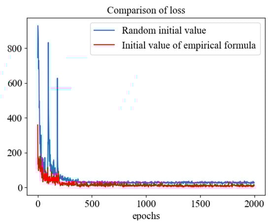 After obtaining the input–label pairs, Equation (9) is used as the loss function, and the network parameters are updated using the Adam gradient descent algorithm. The batch size is set to 32 with an initial learning rate of 0.002 for the gradient descent method, which is multiplied by 0.1 every 200 rounds, amounting to a total of 2000 training rounds. An RTX-4070 GPU is used for training, which lasts 1.5 h. During training, the loss gradually decreases and eventually converges. The training with empirically initialized inputs is compared to training with randomly initialized inputs, as illustrated in Figure 11. The blue curve represents the randomly initialized inputs, and the red represents the empirically initialized inputs. Both use the same number of training rounds and hyper-parameter settings. From the graph, it can be observed that using empirical formula initialization inputs leads to faster convergence.