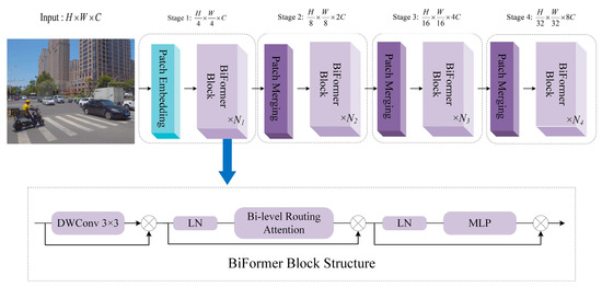 BiFormer utilizes a four-stage pyramid structure with BRA as its core module. In the first stage, overlapping patch embedding is employed, while in the second to fourth stages, a patch merging module is used to decrease the input spatial resolution while increasing the number of channels. Then, N consecutive BiFormer blocks are employed to transform the features. Indicates a convergence between the two. In each BiFormer Block, a 3 × 3 deep convolution is first used to implicitly encode the relative position information. Then, the BRA module and the 2-layer MLP module are applied sequentially for cross-position relation modeling and position-by-position embedding, respectively. The overall structure of BiFormer is depicted in Figure 2.