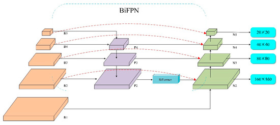 To more effectively address the aforementioned challenges, this study introduces an advanced feature fusion component reconstruction strategy grounded in the principles of the Bidirectional Feature Pyramid Network (BiFPN) [18]. The BiFPN structure, initially introduced by Google in the Efficient Det object detection algorithm, is specifically devised to augment semantic information within features via efficient bidirectional cross-scale connectivity and weighted feature fusion.