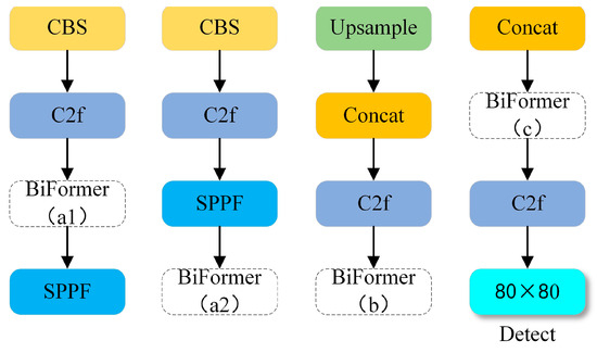 Given the considerable variance in the impact of integrating the attention mechanism at various network locations, this study endeavors to integrate BiFormer at different junctures within YOLOv8n and subsequently conducts experiments. The specific integration points are delineated in Figure 4, while the resultant experimental outcomes are presented in Table 2.