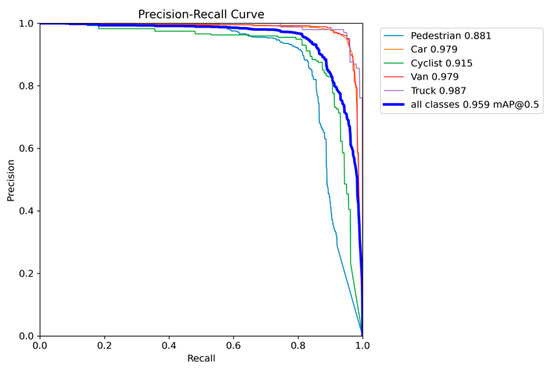 Vehicle–pedestrian detection experiments use precision (P), recall (R), mAP50, mAP50:95, and model size as evaluation metrics. mAP50 denotes the average precision when the IoU is 0.5, and mAP50:95 denotes the average precision when the IoU threshold ranges from 0.5 to 0.95, an increment of 0.05.