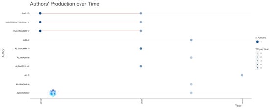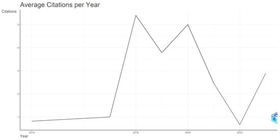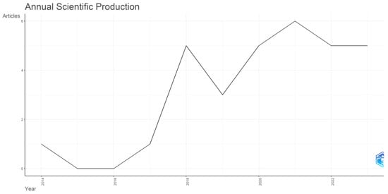 The subsequent inquiry identified in the first section pertained to the characterization of production trends over time within this dynamic domain. As anticipated, considering the significance of the subject matter, a discernible upward trend was evident, indicating an average annual scientific production growth of 25.85%. Throughout the analyzed timeframe of 2014–2023, certain years witnessed no publications in this domain (e.g., 2015 and 2016), while others experienced heightened publication rates, with a peak of six articles in 2021.