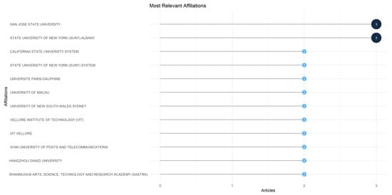 The most prestigious affiliations, according to the number of published articles, that were uncovered during the analysis were San Jose State University and State University of New York (Suny), Albany, each with three published works.