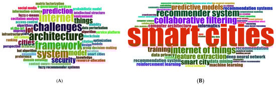 Table 10. In the case of abstracts, the first position was held by “smart city” with 33 occurrences, while for titles, “recommender system” was identified, with 7 occurrences. In second place was “recommender systems” (abstracts—27 occurrences; titles—7 occurrences), while in third place was “smart cities” (abstracts—24 occurrences; titles—7 occurrences). For the entire list, please consider
