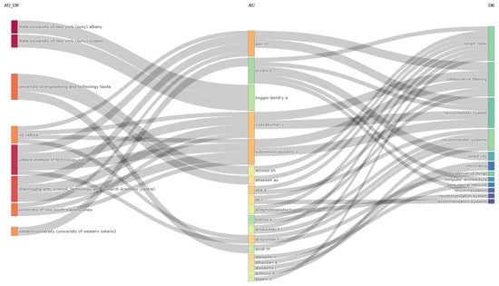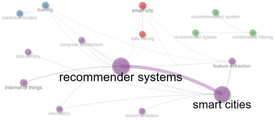 Table 9 includes the top 10 most frequent words, this time searched in authors’ keywords, listed in order as: “recommender systems” and “smart cities”—each with 13 occurrences, “collaborative filtering”, “internet of things”, and “recommender system”—each with 4 occurrences, “feature extraction”, “predictive models”, “smart city”, and “training”—each with 3 occurrences, and “computer architecture”—with 2 occurrences.