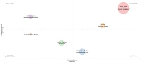 The niche themes included machine learning and recommendation systems, the motor themes comprised of smart cities, recommender systems, feature extraction, training, and predictive models, the basic themes involved collaborative filtering and the recommender system, while the emerging or declining themes included Internet of Things, informatics, and the recommendation system.