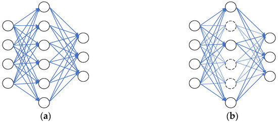 Dropout illustration. (a) Standard neural network model. (b) Neural network model using the random discard principle.