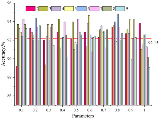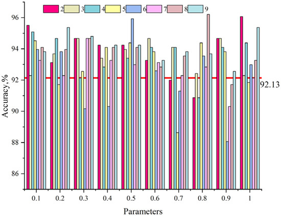From Table 6, it can be observed that when M is maximized, , while when FAM is maximized, . The percentage increase in M from to is 1.27%. Conversely, the percentage decrease in FAM from to is 0.46%. Hence, is selected as the final parameter. Similarly, from Table 7, it can be inferred that is the final parameter.