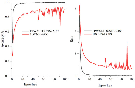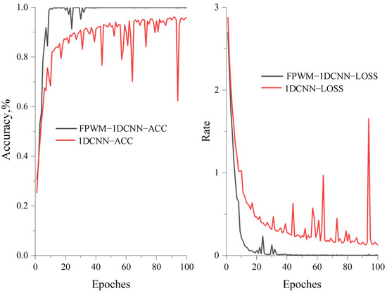 The test bearings were single-row aligning roller bearings (N205 and NU205). The bearing failure was artificially induced by wire cutting, which consisted of three types of bearing faults at speeds of 600 r/min, 800 r/min, and 1000 r/min, including inner ring faults, outer ring faults, rolling element faults, and normal data at each speed, with a sampling frequency of 50 kHz. A total of 10 datasets were selected for the experiment, comprising three types of fault data at each speed and normal data at the 1000 r/min operating condition. The specific experimental setup is illustrated in Figure 8. Similarly, both FPWM-1DCNN and 1DCNN were employed for fault diagnosis experiments on the aforementioned fault data, with settings identical to the previous section. The diagnostic results of the models are depicted in Figure 9. FPWM-1DCNN quickly converged and achieved 100% diagnostic accuracy. The visualization of the data for both models is shown in Figure 10.