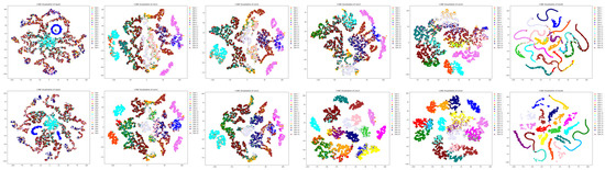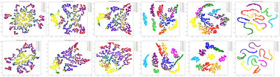 To verify the diagnostic capability of the model constructed after parameter selection in the above experiment, we conducted diagnostic tests on a multi-operational condition bearing fault dataset consisting of 20 types of faults, composed of 2 hp and 3 hp. At this point, the data truncation window moved in steps of 256, with 100 iterations, resulting in a final diagnostic accuracy of 99.13%, as shown in Figure 6. In Figure 6, we plotted a comparison of the diagnostic process of the model with and without the feature parameter weighting module. The 1DCNN diagnostic model without FPWM achieved only 90.18% diagnostic accuracy. It is evident from Figure 6 that the inclusion of the feature parameter weighting module significantly improves the diagnostic accuracy of the model. Additionally, we visualized the feature data during the training processes of the two models using t-SNE technology, as depicted in Figure 7. The first row in the figure represents the visualization of the training process for 1DCNN, while the second row represents FPWM-1DCNN. Each image in the row represents input data, output data of the first convolutional block, output data of the second convolutional block, output data of the third convolutional block, output data of the fourth convolutional block, and the final classification result, respectively. It can be observed that FPWM-1DCNN achieves classification and clustering of different faults effectively during the final fault diagnosis.