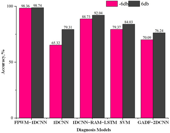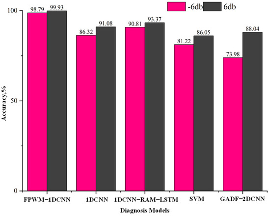 We conducted experiments by adding 6 dB and −6 dB noise to the original fault data separately, using the noisy data to verify the robustness of the proposed diagnostic model. We compared it with several research methods to highlight the robustness of our diagnostic model to noise. These comparisons aimed to showcase the effectiveness of our diagnostic model in noisy environments.