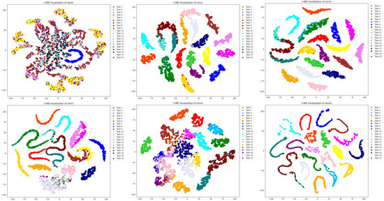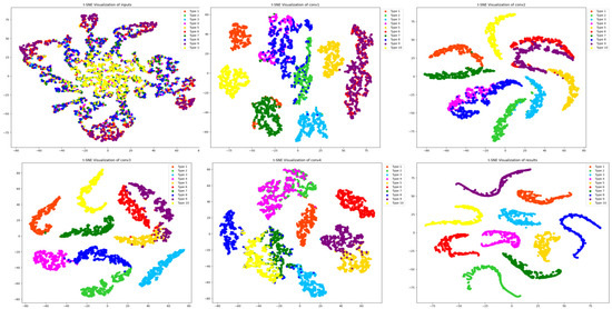 In the same vein, a multi-condition experiment was conducted on the Case Western Reserve University bearing dataset, where −6 dB and 6 dB noise were respectively added under two different operating conditions to construct a multi-condition bearing fault noise dataset. These datasets were then fed into our proposed FPWM-1DCNN diagnostic model for noise resistance validation. As depicted in Figure 13, our model achieved a diagnostic accuracy of 98.36% under the −6 dB noise condition, surpassing all comparative methods. Figure 14 illustrates the feature visualization of the diagnostic process of our proposed model on the −6 dB fault data, demonstrating precise classification and clustering of the fault data.