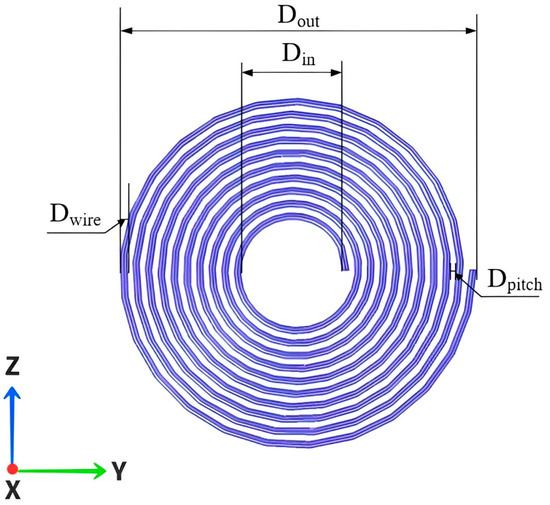 Considering the spatial constraints of the artificial heart implantation environment, the receiving coil is embedded within the human thoracic cavity, and the transmitting coil is placed close to the surface of the thoracic cavity. Therefore, the wireless energy transmission system generally employs planar spiral coils rather than volumetric spiral coils. This study aims to enhance the coupling coefficient between coils and the system’s transmission efficiency, optimizing the parameters of the transmission coils using the COMSOL finite element simulation software. Due to the numerous variable parameters of both coils, it is challenging to optimize the parameters of both the transmitting and receiving coils simultaneously. Hence, this research focuses on the parameter optimization of the transmitting coil located outside the body. The structure of the planar coil is shown in Figure 3, where represents the coil’s outer diameter, is the coil’s inner diameter, is the diameter of the Litz wire, and is the pitch of turns. In the simulations and subsequent experiments of this section, the specifications of the receiving coils are all Litz wires, composed of 400 strands, each with a diameter of 0.04 mm. The receiving coil has a wire diameter of 1.1 mm, an outer diameter of 60 mm, an inner diameter of 20 mm, 15 turns, and a pitch of turns of zero.