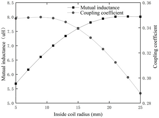 Considering the spatial constraints of the human thoracic cavity, the maximum outer diameter of the transmission coil is generally restricted to 60 mm, while the inner diameter can vary. To explore the impact of the transmitting coil’s inner diameter on the Transcutaneous Energy Transmission Systems (TETSs), the simulation was set with an X-axis misalignment distance of 15 mm and analyzed from the perspective of mutual inductance and the coupling coefficient between the coils is conducted, as shown in Figure 4.