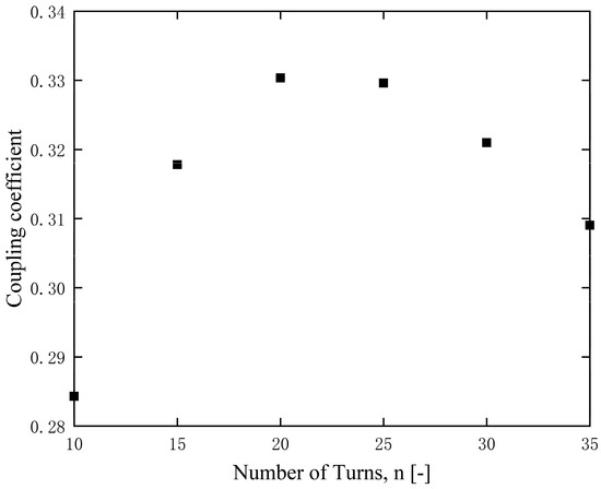 As one of the main parameters of a coil, an increase in the number of turns implies a larger coil area, which in turn expands the range of magnetic field radiation. To investigate the impact of coil turn number on the system, this paper uses finite element simulation software to calculate an optimal number of turns. In the simulations, the transmission distance of 15 mm in the X-axis direction was set and the number of turns in the transmitting coil was varied from 10 to 30 in increments of 5 turns, with an inner diameter of 30 mm for the coil. The coupling coefficients between the two coils are shown in Figure 5.