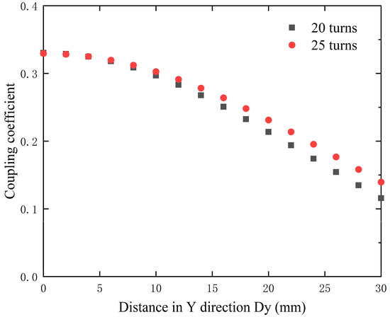 As observed from Figure 5, the coupling coefficient initially increases and then decreases as the number of turns increases, with notably higher values at 20 and 25 turns. This pattern indicates that having more turns is not always beneficial for the system. To better compare the changes in the coupling coefficients at 20 and 25 turns, the simulation was set with an X-axis misalignment distance of 15 mm and the Y-axis misalignment distance varied between the two coils. The results, as shown in Figure 6, indicate that the coil with 25 turns exhibits a significantly smaller variation in coupling coefficient under misalignment conditions compared to the coil with 20 turns. Consequently, 25 turns was selected as the optimal number of turns for the coil.