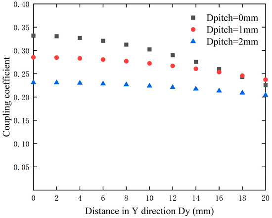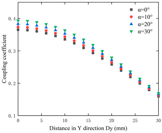 To better demonstrate the changes in the coupling coefficient of the curved coil when Y-axis misalignment occurs, in the simulation, the X-axis misalignment distance was set to 15 mm with a Y-axis misalignment range of 0–30 mm. The changes in the coupling coefficient for coils at various angles of curvature are shown in Figure 9.