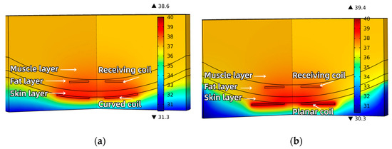 In Figure 10, the temperature distribution of the transmitting and receiving coils after being powered for 30 min are illustrated. Specifically, as shown in Figure 10a, the temperature increase is more uniform in both the curved coil and the surrounding skin tissue. In contrast, Figure 10b shows that the planar coil exhibits more pronounced localized heating. Furthermore, the simulation results indicate that the peak temperatures for the curved and planar coils are 38.6 °C and 39.4 °C. Notably, the peak temperature of the curved coil differs by 2.1 °C from the initial temperature of the human tissue and blood, while the peak temperature of the planar coil differs by 2.9 °C. Therefore, for implantable medical devices that require prolonged use, the curved coils offer superior temperature performance compared to planar coils, potentially reducing the risk of thermal damage.