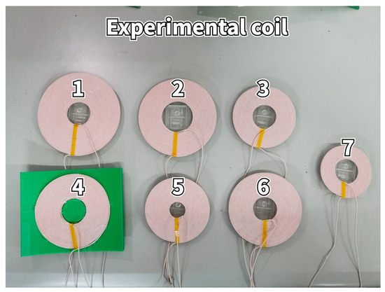 To validate the optimization simulation results of Section 2 from the perspective of publishing journal papers, coils with different parameters were designed based on the previous finite element simulations. Coils, as shown in Figure 12, were wound with varying turns, inner diameters, and degrees of bending. However, the specifications of the coils were all Litz wires, composed of 400 strands, each with a diameter of 0.04 mm. The coupling coils in the wireless power transfer system studied herein adopted an asymmetric design, meaning the transmitting and receiving coils were of different sizes. Among them, Coil 7 serves as the receiving coil, while Coils 1 to 6 serve as transmitting coils. The specific parameters of the coils are listed in Table 2.