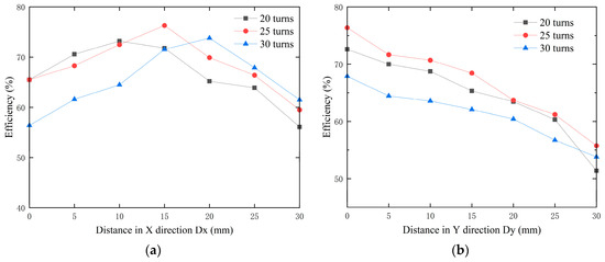 As illustrated in Figure 13a, when the receiving coil remains the same, the system efficiency for different numbers of turns initially increases and then decreases with the increasing misalignment distance along the X-axis. The increase in efficiency during the initial phase is due to the enhanced magnetic coupling resulting from the adjustment of coil positions, whereas the decrease in efficiency during the later phase is attributed to the excessive misalignment weakening the coupling. Additionally, the peak transmission efficiency for the three sets of coils occurs at different misalignment distances. Specifically, the 25-turn coil achieves the highest efficiency of 77% at an X-axis misalignment distance of 15 mm, while the 20-turn and 30-turn coils reach their respective peak efficiencies of only 73% and 74%.