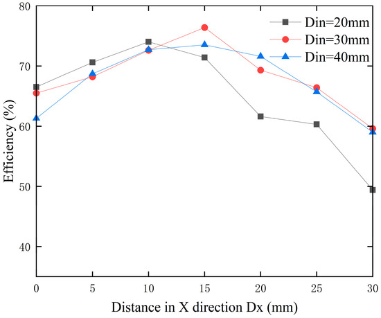 As indicated by Figure 14, the transmission efficiency of transmitting coils with different inner diameters initially increases and then decreases with the increase in X-axis misalignment distance. The coil with an inner diameter of 30 mm achieves the highest efficiency of 77% at a transmission distance of 15 mm, while the peak efficiencies for coils with inner diameters of 10 mm and 20 mm are only 72% and 73%, respectively. Therefore, using a transmitting coil with an inner diameter of 30 mm is preferable, and the experimental results are consistent with the simulation outcomes.