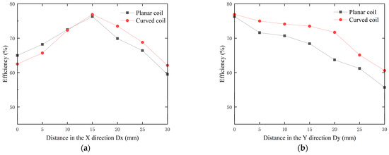 Effect of curved coil on system transmission efficiency: (a) X-axis misalignment; (b) Y-axis misalignment.