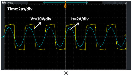 As shown in Figure 15, during X-axis misalignment, the transmission efficiency of the curved coils is slightly lower than that of the planar coils before 10 mm, but beyond 10 mm, the efficiency of the curved coils consistently exceeds that of the planar coils. When Y-axis misalignment occurs at , the transmission efficiency of the curved coils is higher than that of the planar coils, and the efficiency changes more steadily within the range. Therefore, curved coils demonstrate superior resistance to misalignment compared to planar coils. Figure 16 shows the voltage and current signals at the transmitting and receiving ends for the curved coil at , illustrating that both voltage and current signals are in phase when the system resonates.