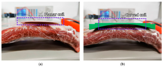 To verify the temperature rise of curved and planar coils, the experiment utilized pork ribs, which are similar to the human thoracic cavity, as a biological medium with a central thickness of approximately 15 mm. The coil temperature measurement experiment is shown in Figure 17, with the receiving coil placed under the biological tissue. The temperature measurement experiment used a YET-610L single-channel thermocouple thermometer, which offers a temperature measurement range from −200 °C to 1370 °C, a measurement resolution of 0.01 °C, and an accuracy error of ±0.4 °C. The K-type thin-film thermocouple probe used can closely conform to the surface of the biological tissue, allowing for more precise temperature measurements.