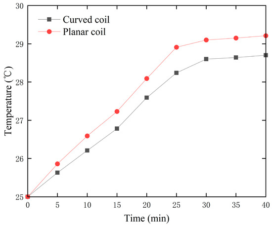 Temperature variation of coils: (a) curved coil temperature; (b) planar coil temperature.