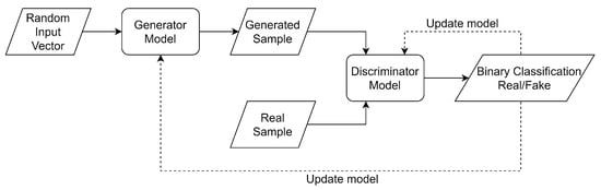 These two networks engage in a competitive dynamic, where the generator seeks to deceive the discriminator, which in turn adapts to more accurately classify new synthetic data. This iterative process enhances the generator’s ability to produce data increasingly indistinguishable from actual data. The discriminator’s output, typically derived from a sigmoid function, quantifies the probability of data being real, with representing this probability. The discriminator aims to minimize a cross-entropy loss function, while the generator endeavors to maximize it, indicating a min–max game between the two networks. The process is visualized in Figure 2, illustrating the iterative training cycle that refines both networks.
