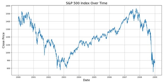 This section details a case study utilizing a QWGAN-GP model (the code used for the experiments, together with the instructions to execute them, can be found on the Github repository https://github.com/EBarbierato/Enhancing-Financial-Time-Series-Prediction-) for synthesizing data corresponding to the S&P 500 index. It implements the model’s quantum generator and classical Critic architectures (the architecture used to perform the experiments consists of qBraid Lab, a comprehensive cloud platform tailored for quantum computing, equipped with a custom notebook environment that integrates with tools like GitHub and VSCode. It provides access to numerous quantum computing resources, including over 20 quantum computers and simulators via the qBraid SDK. The SDK allows for easy programming across different quantum frameworks and seamless execution on quantum hardware. For example, users can create quantum circuits using one framework, like PennyLane, then transpile these using another, such as Qiskit, and execute them on a third platform like Amazon Braket, showcasing the SDK’s versatile application capabilities). Moreover, it explores various S&P 500 predictions using an LSTM model with different synthetic datasets to ascertain the optimal data combination for prediction accuracy. The dataset, derived from the “yfinance” Python library, spans 1 January 2000 to 31 December 2008, a period chosen for encompassing the Great Financial Crisis, characterized by significant market volatility and the occurrence of extreme events, thus reflecting the broader U.S. economic landscape (see Figure 3 with daily resolution).