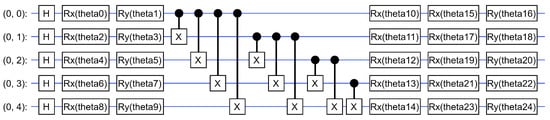 - Entangling layers: In the model, the entangling layers were constructed using CNOT gates, which are non-parametrized gates. These CNOT gates were applied to every pair of qubits within the quantum circuit. The purpose of using CNOT gates in this manner is to establish entanglement between all pairs of qubits in the quantum circuit.