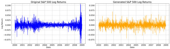 The second approach involves enriching the original time series by incorporating extreme events from the synthetic series. Specifically, 82 extreme data points from the generated time series are added to the original time series. This method is particularly valuable for increasing the model’s capability to predict extreme events when applied to the test set. With this method, the model gains greater exposure to extreme event scenarios, potentially improving its ability to anticipate and handle such events during predictions. In particular, an extreme event () is defined as per Equation (5), where both and are calculated on the original logarithmic returns [21]:
