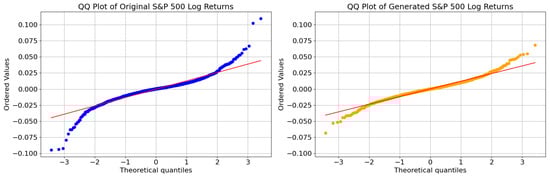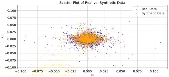 In Figure 8, it is observed that both distributions, the original data distribution and the synthetic data distribution generated by the model, deviate from normality. However, there are some differences in their characteristics. The distribution of the original data exhibits greater skewness, indicating that it deviates more significantly from a normal distribution. Interestingly, in the central region, encompassing the quantiles between and 2, both distributions closely follow a normal distribution. This suggests that a substantial proportion of observations from each distribution are similar and exhibit behavior consistent with a normal distribution within this range.