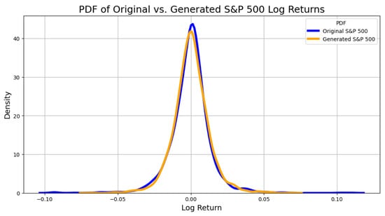 Figure 9 shows that in the central part, where most of the changes are included, the two distributions are pretty similar. In the tails, the original data present more extreme events, with higher values, compared to the generated one, as the QQplot also highlights. However, this representation does not perfectly reflect the two distributions because the bins are a discretization of the Log Return values. Indeed, in Figure 10, which represents the continuous PDF, the two probability distributions nearly overlap each other. As evidence of this high similarity, the Wasserstein distance, defined as the minimum amount of “work” required to transform one distribution into the other, between the two distributions was calculated, and it was found to be , which is nearly close to zero.