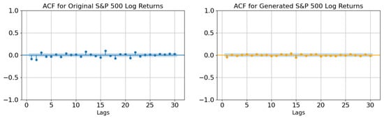 Figure 14 shows that both real and generated data points have a cluster around the center, where the density of points is also higher, which suggests that the synthetic data capture the general behavior of the real data well. Data points do not show any clear pattern; it seems to be that they are randomly dispersed, confirming that there are no elements of autocorrelation. However, real data show more spreads with a higher number of outliers in the graph. This indicates a higher presence of extreme events in the real data than in the generated data. The presence of a pronounced concentration of data points towards the center, along with a significant occurrence of extreme events, implies the existence of a volatility cluster, particularly in the real data. This phenomenon suggests that large returns tend to follow large returns, and small returns tend to follow small returns, indicating a clustering effect in volatility. However, it is worth noting that the synthetic data exhibit fewer extreme values, and as a result, they may not entirely capture this specific aspect of the original data’s behavior.