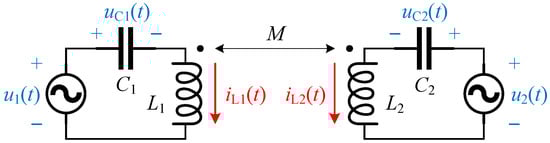 The frequency splitting phenomenon of coupled resonators is manifested as the gain peaks of the network appear at the so-called split frequencies, which are different from the resonant frequencies. The reason is that the eigenvalues of the coupled resonators drift with the increase in the coupling coefficient [,]. To show this more clearly, let us consider the coupled resonators shown in Figure 1, where L1, C1 and L2, C2 are the primary- and secondary-side inductance and capacitance, respectively; M is the mutual inductance; u1 and u2 are the ac excitation voltages; uC1 and uC2 are the resonant voltages; and iL1 and iL2 are the resonant currents.