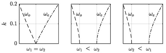 Split frequencies as a function of coupling coefficient under three different cases: ω1 = ω2, ω1 < ω2, and ω2 < ω1.