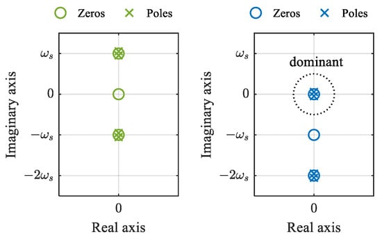 Furthermore, Figure 5 compares the zeros and poles of (3) and (10) on the complex plane. The zeros of (10) locate at ±jω1 − jωs, −jωs ± jω2, and −jωs, and the poles locate at −jωs ± jωo and −jωs ± jωe, which are the translations of the zeros and poles of (3) along the imaginary axis, as indicated by (11). Considering that ω1, ω2, ωo, ωe, and ωs are very close to each other, the dominant zeros of (10) are −jωs + jω1 and −jωs + jω2, and the dominant poles are −jωs + jωo and −jωs + jωe. On the complex plane, these dominant zeros and poles are within the circle whose radius is equal to the Nyquist frequency, i.e., ωs/2, as shown in Figure 5. In a physical sense, the dominant zeros correspond to the beat frequencies, i.e.,
