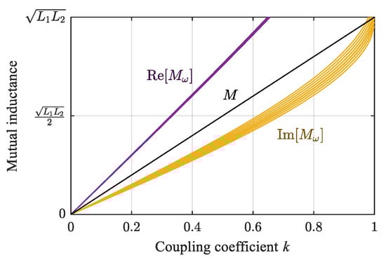 The real and imaginary parts of the equivalent mutual inductance, Mω, as a function of coupling coefficient k.