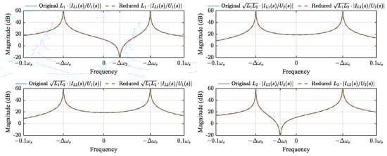 Figure 7 compares the bode diagrams of transfer function (32) derived from the reduced-order model to the bode diagrams of transfer function (10) derived from the original dynamic phasor model (10) within the frequency range from −0.1ωs to 0.1ωs. It is shown that the poles exactly locate at the split beat frequencies, and the two groups of transfer functions match with each other well, even when ω2, ω2, and ωs are not identical. This means that the low-frequency characteristics of the original dynamic phasor model (9) can be precisely represented by the reduced-order model (14).