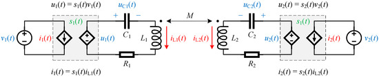 In Figure 8, the switching functions of the two converters are denoted by s1 and s2. For full-bridge converters, s1 and s2 may equal to 1, 0, and −1, depending on the switching control (for an active converter) or resonant current direction (for a diode rectifier). Consequently, the ac excitation voltages u1 and u2 are represented by the products of the switch functions and the dc side voltages v1 and v2 as