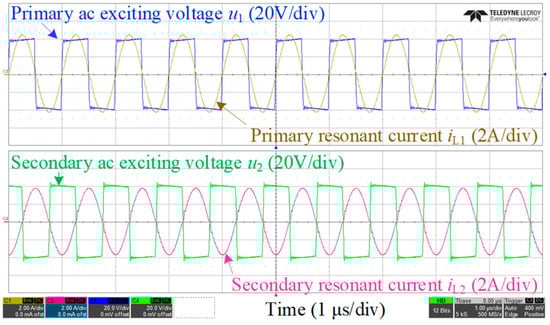 The accuracy of the proposed reduced-order model is verified in this section by the low-power experimental system shown in Figure 9. The system consisted of a pair of coupled resonators made of AWG 46 Litz wires, high-Q ceramic capacitors, and two gallium-nitride full-bridge converters controlled by Zynq development boards. To focus on the dynamics of the WPT stage, the converters were directly fed by bidirectional dc supplies so that the characteristics predicted by the reduced-order state-space model (14) and the transfer functions in (44) could be directly measured and verified. The nominal operating parameters of the system are listed in Table 1, and the steady-state operating waveforms are shown in Figure 10. The transferred power was 100 W and the dc-to-dc efficiency was 93.5%. Thanks to the high-efficiency GaN devices and zero-voltage switching (ZVS) operation [], the losses on the converters were insignificant and most of the system power loss came from the ESR of the coils. For model verification, the representative dynamic characteristics of the system, including both large-signal step responses under ON–OFF control, and the small-signal bode diagrams at steady states, were measured and compared to the model predictions under different test conditions, as listed in Table 2.