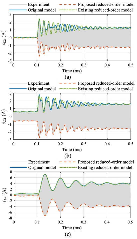 Figure 11 shows the waveforms of secondary-side resonant current iL2 at the beginning of an ON period. The magnitude of iL2, i.e., |IL2|, oscillated quickly when the coupling was strong and oscillated slowly when the coupling was weak. The reason is that the oscillations depend on the split beat frequencies Δωo and Δωe, and the split beat frequencies depend on the coupling coefficient. When the system was slightly detuned, the oscillation mode became more complicated because the beat frequencies Δω1 and Δω2 were no longer zero. Under all tested operation conditions, the proposed reduced-order model (14) and the original dynamic phasor model matched the experimental results (envelopes) well. In contrast, the existing reduced-order model [] was accurate, only with weak coupling, and had accumulated errors when the coupling was relatively strong.