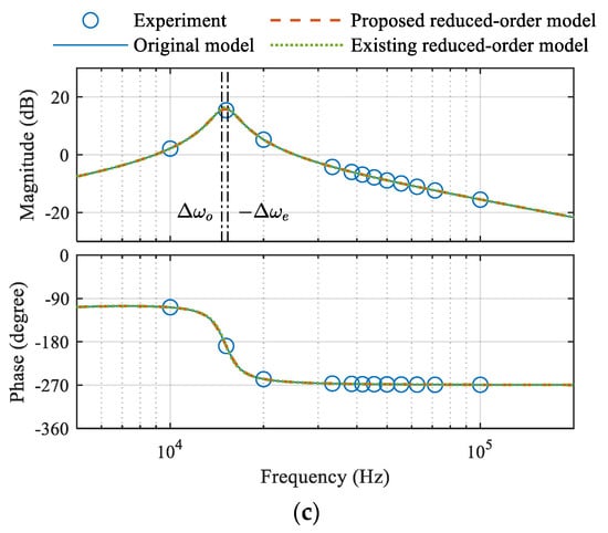 In the experiment, to obtain the small-signal bode diagram of the transfer function , a low-frequency (10~100 kHz) phase perturbation signal of 7.2° magnitude (corresponding to 20 ns) was injected into the steady-state  using a variable time-delay unit, and the responded  was measured by a high-bandwidth current transformer (CST4835), a zero-crossing detector (LMH7220), and a digital phase detector on the Zynq board. Then, the measured time-domain data of  and  were processed with discrete Fourier transform to obtain  at a particular perturbation frequency. Figure 12 shows the small-signal bode diagrams at the steady states of different operating conditions. When the coupling was strong, the gain curve had two peaks that corresponded to the split beat frequencies Δωo and −Δωe, as shown in Figure 12a,b. When the coupling was weak, the two gain peaks merged into one, as shown in Figure 12c. Under all tested operation conditions, both the proposed reduced-order model and the original dynamic phasor model accurately predicted the small-signal characteristics. However, the existing reduced-order model failed to predict the two gain peaks under the tuned and strong coupling condition, and had a bit peak frequency error under the detuned condition.